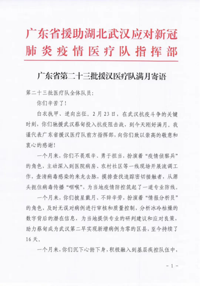 目前,湖北疫情防控形势发生积极向好变化,在各省医疗队陆续撤离的时候,皮肤病医院流行病调查队抱着“疫情不退不归”的心态依然奋战在武汉。3月24日,正值医院公共卫生医师陈磊、熊明洲援汉“满月”之际,广东省援汉医疗队指挥部总指挥余德文发来满月寄语。