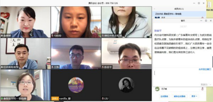 珠江医院驰援武汉医疗队员代表、教职工、学生团支部书记、团干团员代表、青年文明号集体代表、志愿者代表等近80人参加会议,校团委书记陈旭坚出席会议。院团委书记鲁媛媛主持会议。