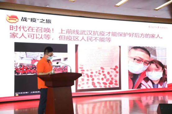 医院团委委员、肾内科团支部书记、援鄂医疗队临时团支部书记陈锦昌,以“绽放战疫青春,坚定制度自信”为主题,分享了他的援鄂故事和个人心得。谈娜带领全体人员重温入团誓词。