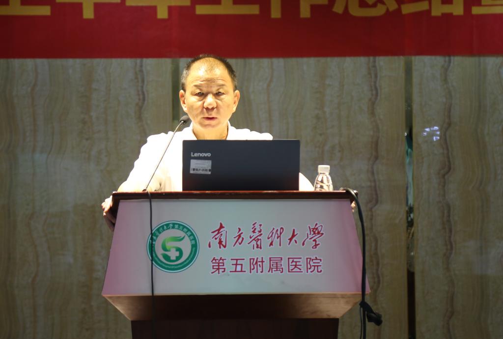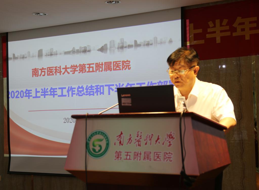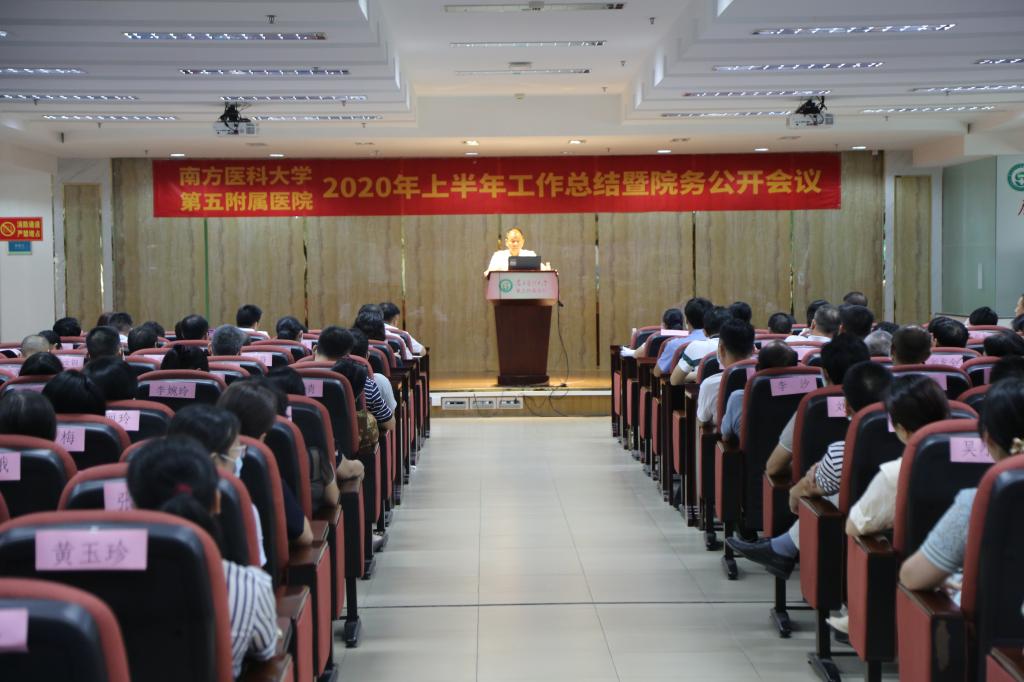 为认真回顾总结医院上半年工作情况,部署下半年工作目标任务,动员全院干部职工振奋精神,坚定信心,真抓实干,努力做好下半年全院各项工作,7月31日,五附院召开2020年上半年工作总结暨院务公开会议。会议由党委书记李绍波主持,院领导班子、部门正副职、科室主任、支部书记、护士长以及“双代会”代表等参加了会议。