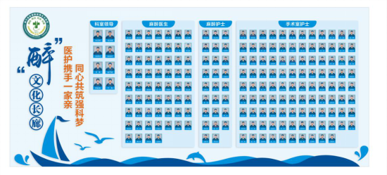 今年,麻醉科积极争创院级“青年文明号”,进一步推动科室文化建设。在科室领导的建议下,科室建立了“醉”文化长廊,并由古妙宁、刘克玄、史永胜、秦再生、林春水、李偲、张军花、丁红为文化长廊揭幕,让每一位同事的笑颜开启新一天的工作。