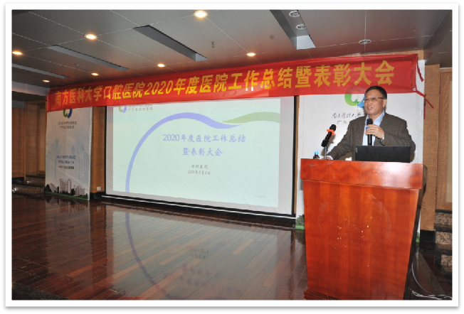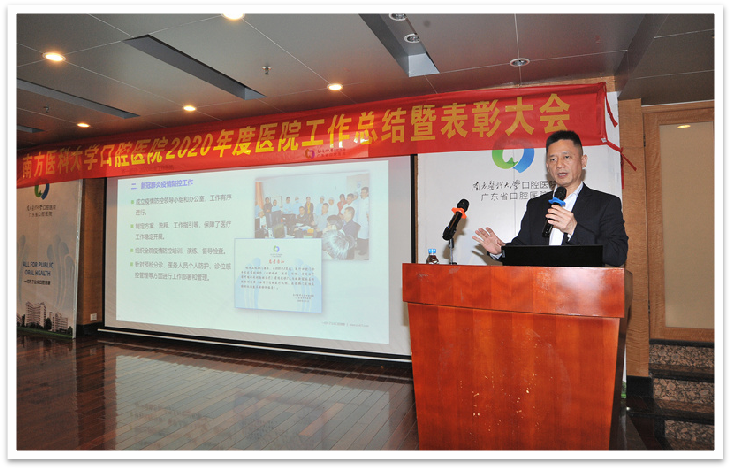 院长黄少宏作2020年医院工作总结报告。他指出,在医院党委的领导下,医院教职工齐心协力,奋发图强,在党建引领、疫情防控、医疗护理、科教、牙防、学科和人才建设等各方面的工作中都取得了可喜的成绩。黄少宏院长还就2021年医院重点工作任务进行了部署:一是加强党的全面领导,为医院发展提供坚强保证;二是推动学科建设工作,聚人才促科教进步;三是以创三甲为抓手,着力高水平医院建设;四是加快基础建设,促进多院区同步发展;五是着力提升技术水平,完善精益医疗管理;六是筑牢“防控线”,做好疫情防控工作。