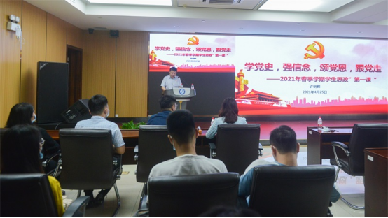 许明辉以“学党史,强信念,颂党恩,跟党走”为主题,以“从百年党史中感悟顽强奋斗的光辉历程”“从百年党史中汲取弥足珍贵的前进力量”“从百年党史中强化青年学生的使命担当”三个部分内容讲述,与学生们分享了自身的学习所得与感悟,结合自身的成长及工作经历,勉励大家以史为鉴,做时代发展的“逐梦者”,以史为师,做善学善思的“学习者”,以史明志,做崇尚英雄的“奉献者”,通过党史学习教育,深刻了解党史的重大事件、重要会议、重要人物,了解我们党领导人民进行艰苦卓绝的斗争历程,了解我们党百年的光荣传统、宝贵经验和伟大成就发扬革命传统,牢记历史使命,坚定不移跟党走。他希望大家在学校(医院)学习的这段时间里学有所成,在火热的青春中放飞梦想,在宝贵的青春中乘风破浪,在拼搏的青春中成就事业的华章。
