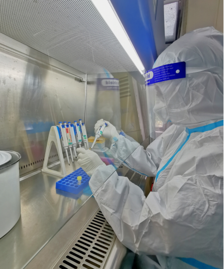 虽然没有烈日暴晒,没有风吹雨打,但是在空间紧凑的PCR实验室里,余晓腾每天全副武装,和病毒“正面交锋”,他们在离病毒最近的地方默默“战斗”。常常在实验室里一待就是七八个小时以上,为了节约防护器材,他们尽量不喝水,不上厕所。
