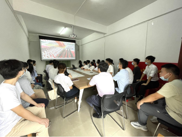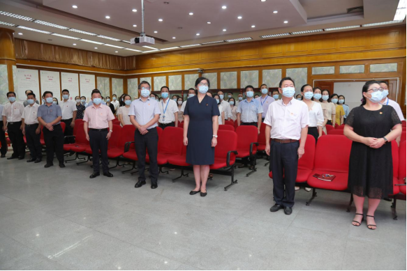 在学术会议厅观看现场,党员胸前佩戴鲜红的党徽,手持国旗,集中收看直播盛况,聚精会神聆听习近平总书记在庆祝中国共产党成立100周年大会上的重要讲话,共同见证举世瞩目的历史时刻。