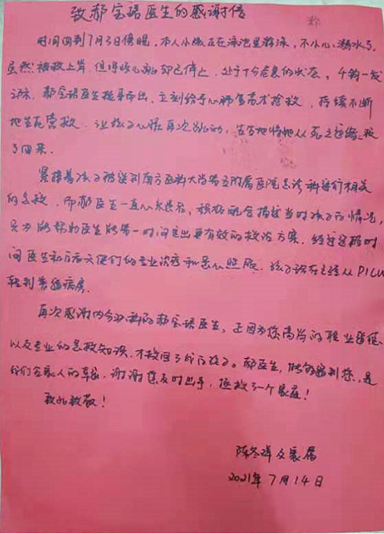 又讯7月14日上午,在五附院内分泌科,5岁女童小敏(化名)的爸妈,把印有“见义勇为、救人英雄”字样的锦旗和一张鲜红的感谢信送到郝宝珺医生的手中。
