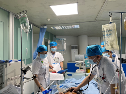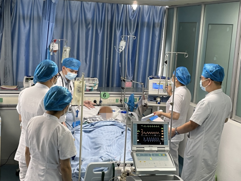 此时患者呼吸、心跳骤停,无法行心脏介入手术治疗。心血管内科一区介入手术团队、介入科护理团队均在导管室准备好仪器设备,抢救药物准备随时进行急诊介入手术。