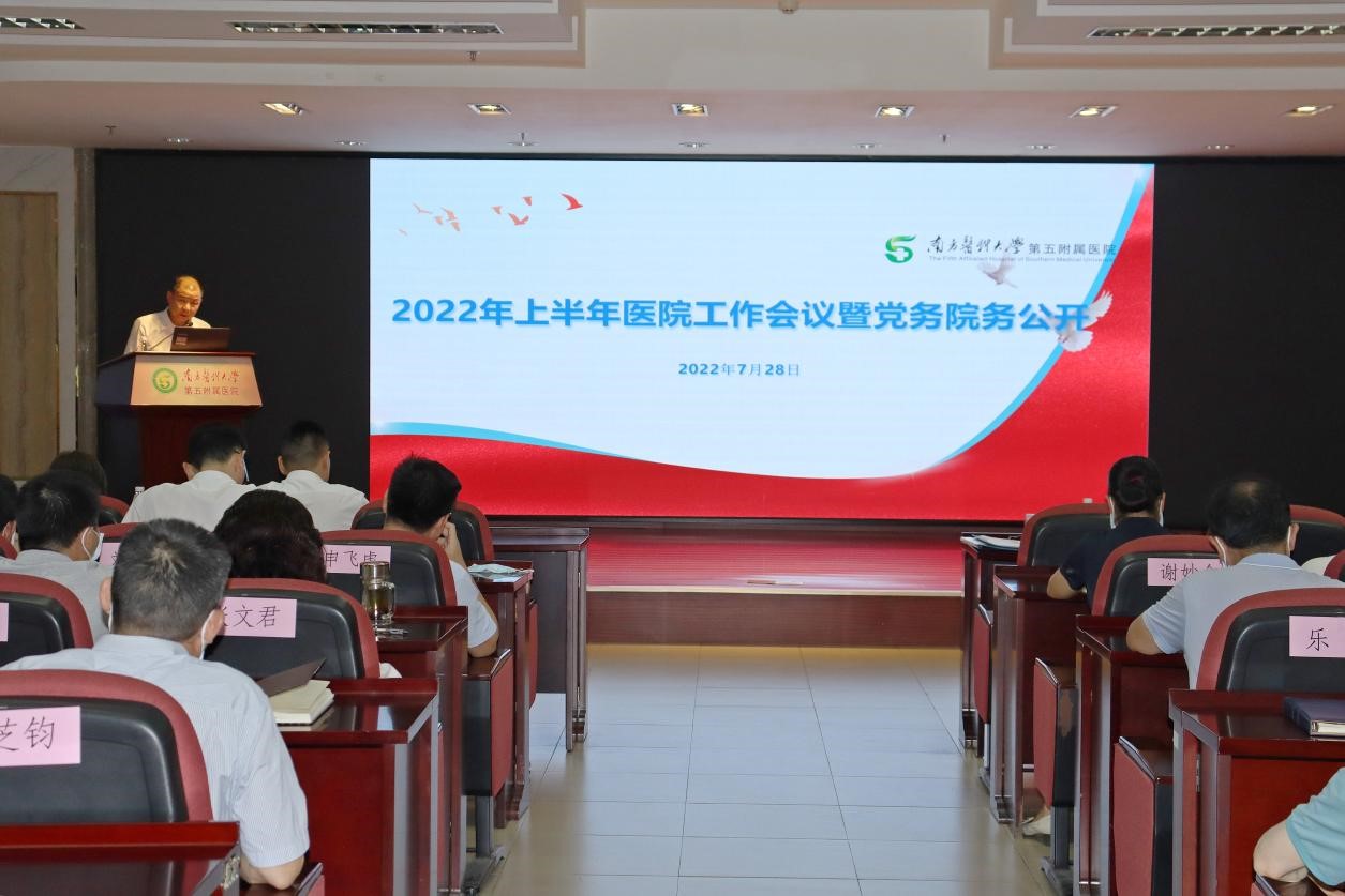 7月28日下午,第五附属医院召开上半年医院工作会议暨党务院务公开会,梳理盘点上半年工作,部署下半年重点工作,进一步统一思想,凝聚共识,推动医院高质量发展。会议由医院党委书记李绍波主持,医院领导班子,双代会代表,支部书记,科室主任、护士长参加了会议。