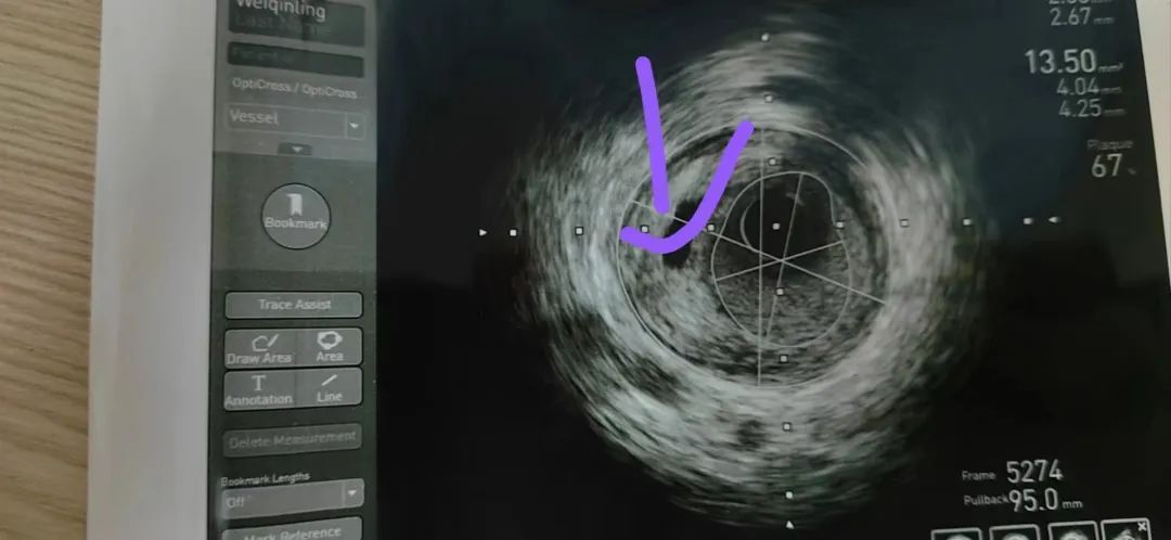 经导管冠脉造影显示,魏伯左侧前降支血管狭窄与2019年造影结果大径相似,血管内超声检查发现其冠状动脉内斑块形成溃疡夹层,导致心绞痛发作,经家属同意后在前降支血管内成功植入支架。