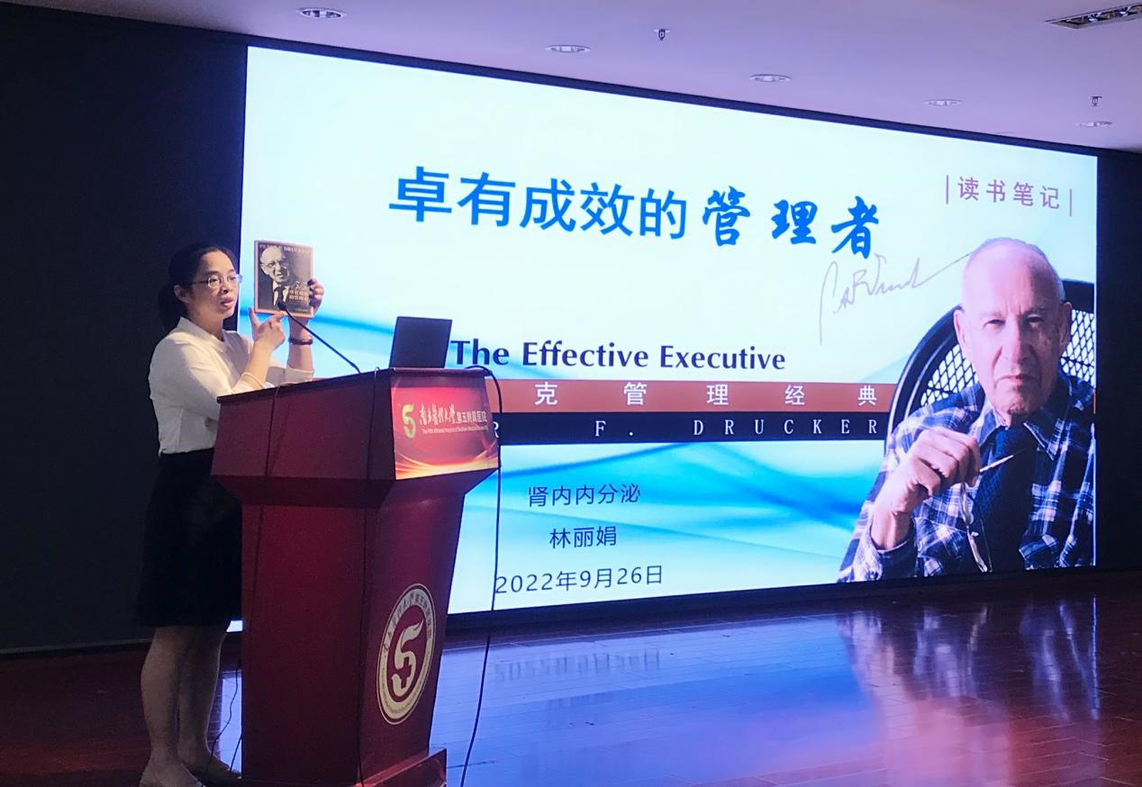 新生儿科护士长徐丽容和肾内内分泌科护士长林丽娟一起分享《卓有成效的管理者》,分别从多角度、多维度分享读书心得徐丽容从“卓有成效”的学习方式出发提出,每一位护士都是自己的管理者,工作中要善于提出自己的见解,帮助解决疑难问题做好患者管理;每一位护理管理者在团队合作中做好有效沟通,在工作效益中挖掘个人价值。结合日常工作案例她强调了理清观念、改变行为、获得卓有成效的重要性。