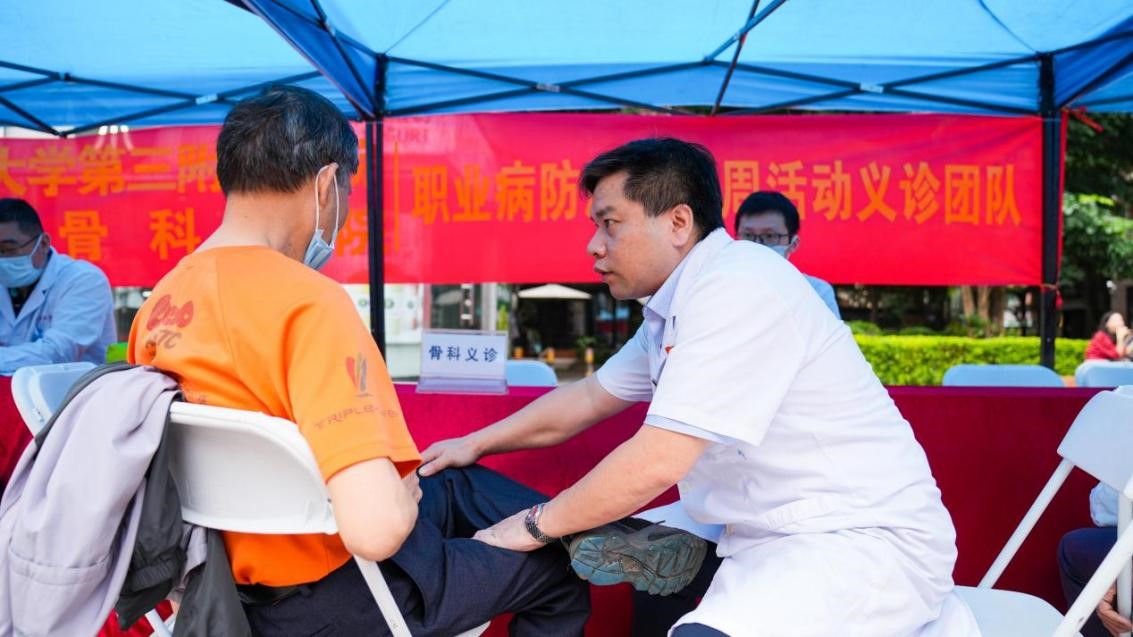 4月25日至5月1日是第21个全国《职业病防治法》宣传周,今年的主题是“改善工作环境和条件,保护劳动者身心健康”。4月28日,天河区卫生健康局、天河南街道办通过“区-街-居”三级公共卫生委员会联动机制在天河南街举办义诊咨询活动。作为广东健康教育志愿服务骨科支队队员,第三附属医院脊柱外科一科副主任医师王其友,脊柱外科二科副主任医师闫慧博,关节外科·运动医学科副主任医师方航、主治医师潘剑英,创伤骨科医师王海波,康复医学科主治医师冯琼波参加了义诊。