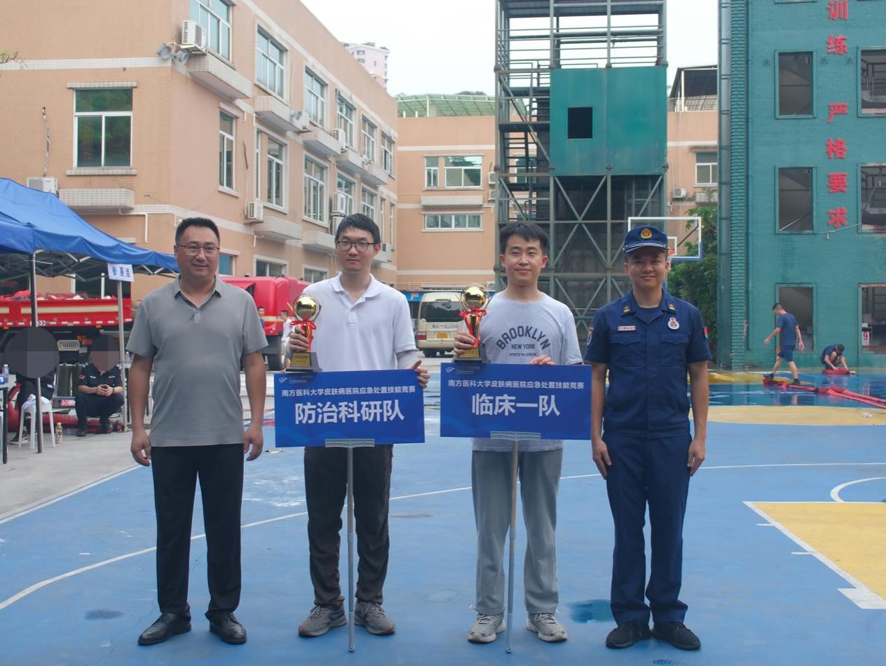 登峰街道应急办科长杨勇、消防救援站站长何宇旋为获得二等奖的队伍颁奖