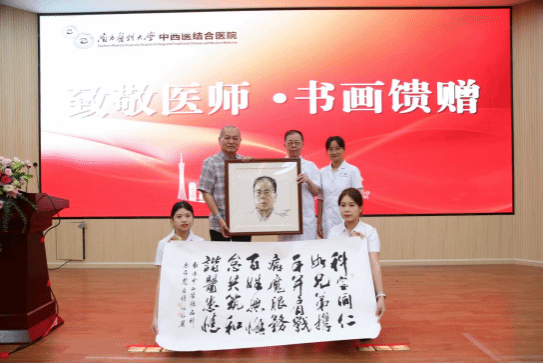 全国医德标兵、脑病科陈俊抛主任接受国画老师李伟文创作的个人肖像画以及何伯昌给脑病科创作的科室寄语