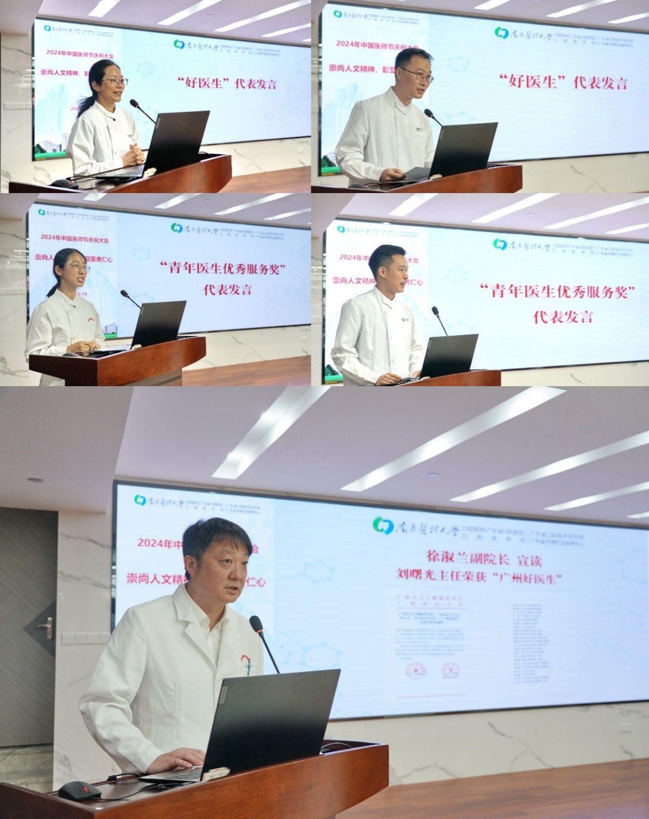 “广州好医生”及医院“好医生”“青年医生优秀服务奖”获奖者代表分享了各自的从医故事,表达了个人对工作的热爱和对卫生事业的忠诚与执着。“组团式”援疆医师邱小玲、周震,“双百行动”结对共建医师代表卢煜也通过视频分享了工作感言。