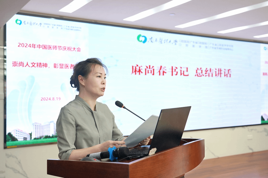 医院党委书记麻尚春提出三点希望:一是要以德为先,铸就仁心。医务工作者要不断加强自身修养,以一颗仁爱之心对待病人,让群众更有获得感、幸福感、安全感。二是要强化身份意识,促进医教研全面发展。医者,亦是师者、研究者,要认真锻造护佑人民口腔健康过硬的本领,做好人民群众口腔健康的“守护着”,传道授业解惑的“传承者”,勇攀医学高峰的“攀登者”。三是要落实惠医政策,一如既往关心关爱广大医生群体。要搭建医务工作者成长的平台,落实好各项惠医政策,切实保障医务工作者权益。她表示,新的时代赋予了医者们新的使命和责任,希望口腔医院医师们深入贯彻落实党的二十大和二十届三中全会精神,切实担负起推进健康中国建设神圣使命,共同谱写医院高质量发展新篇章。
