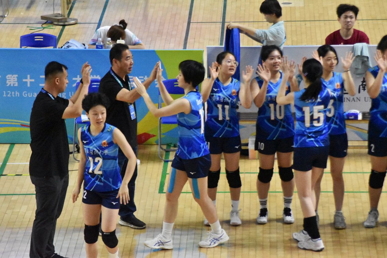 在小组赛中,校女排以3:0分别击败香港中文大学(深圳校区)和广州医科大学。在小组头名之争中,以小组第二名晋级八强。在8进4的比赛中,我校女排遇到D组头名广东海洋大学,最终以3:0战胜对手,成功锁定四强。校队教练评价,去年的预赛中,女排因配合生疏而丢分,但今年,无论是快攻战术的执行,还是防守轮转的流畅度,都有了显著进步。队长说:“我们比去年更懂得如何互相弥补不足、互相支持,现在的我们更像一个真正的团队。”
