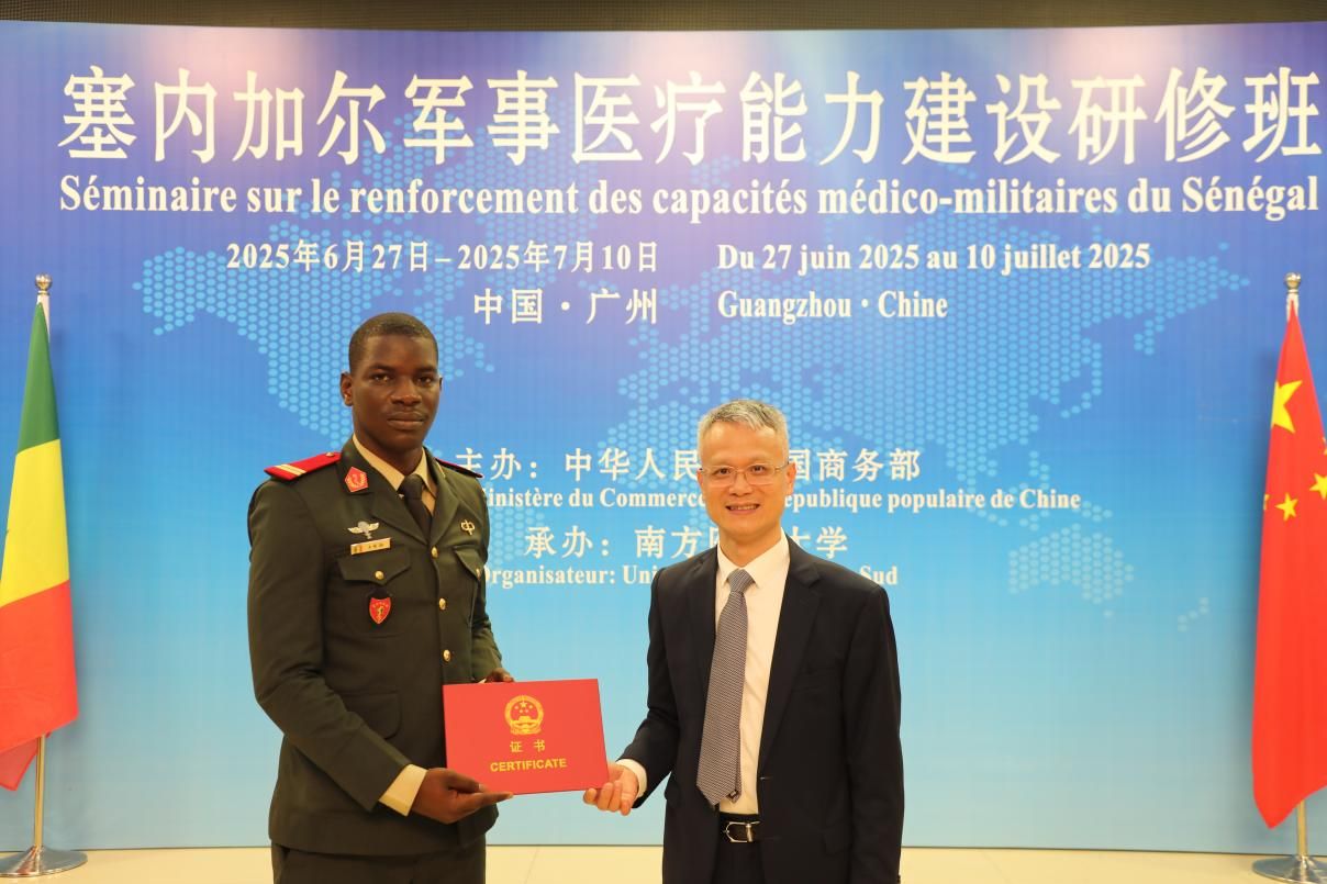 近日,由商务部主办、我校承办的国家援外培训项目“塞内加尔军事医疗能力建设研修班”结业仪式在学校秋水堂春江厅举行。学校副校长许可慰出席仪式并致辞,国际教育学院领导以及全体塞内加尔军医参加仪式。