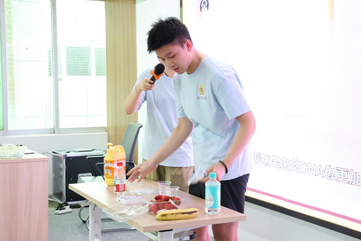 下午的“一起玩转DNA”活动中,主讲员徐飞以生动讲解引导学生认识DNA的结构与功能。在“神奇的草莓实验”环节,学生按照“捏-萃-注-提”步骤亲手提取草莓DNA,直观观察到乳白色的DNA丝状物,切身感受生命科学的奇妙。 活动通过科普讲解与动手实践相结合的方式,让学生掌握科学实验基本方法,激发对生命科学的探索兴趣。