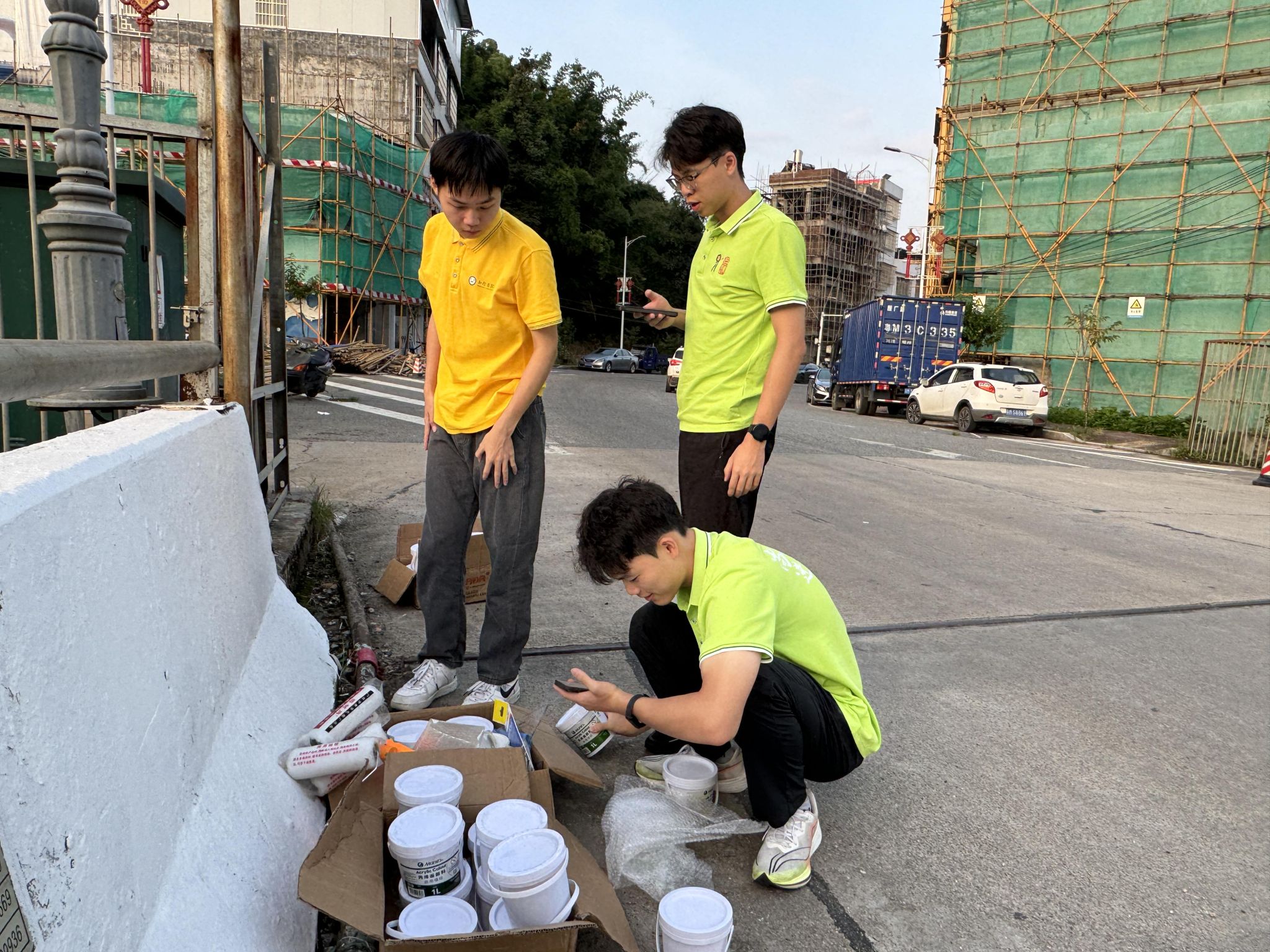 15日清晨6时,团队准时开工。成员分组协作,绘画组、设计组、后勤保障组各司其职。顶着酷暑高温,队员们合理利用早晚凉爽时段高效作业,勾线稿、调颜料、疏导交通……
