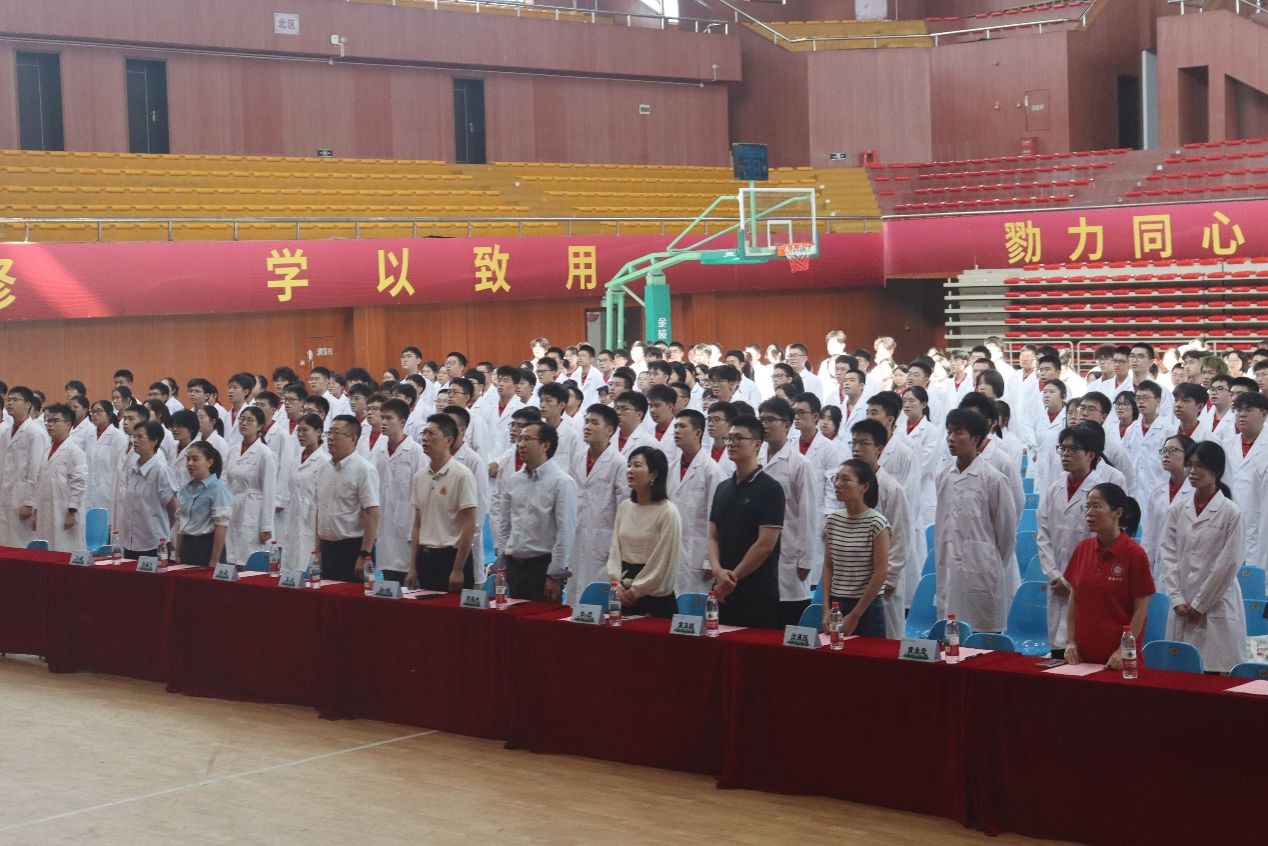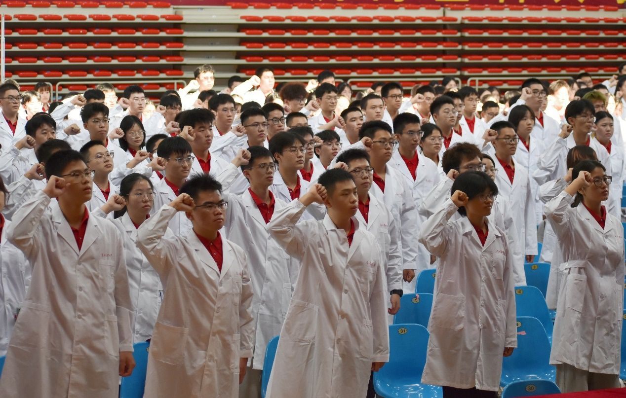 9月14日,在第一临床医学院2025级本科新生见面会暨军训动员大会上,院长孙剑为新生披上象征医者使命的白大褂,全体新生正冠宣誓,齐唱院歌,以健康所系,性命相托的誓言开启医学人生新篇章。