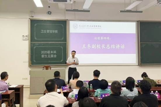 王冬介绍了学院的历史沿革和特色发展,对新生提出三点期望:明确“为何学”,理解“大我”与“小我”的责任担当;明晰“学什么”,发挥“精学”与“宽学”的同向性;掌握“怎么学”,培育“毅力”与“勇气”的韧性。他勉励新生要将国家使命与专业学习相结合,树立明确目标,为健康中国建设贡献青春力量。