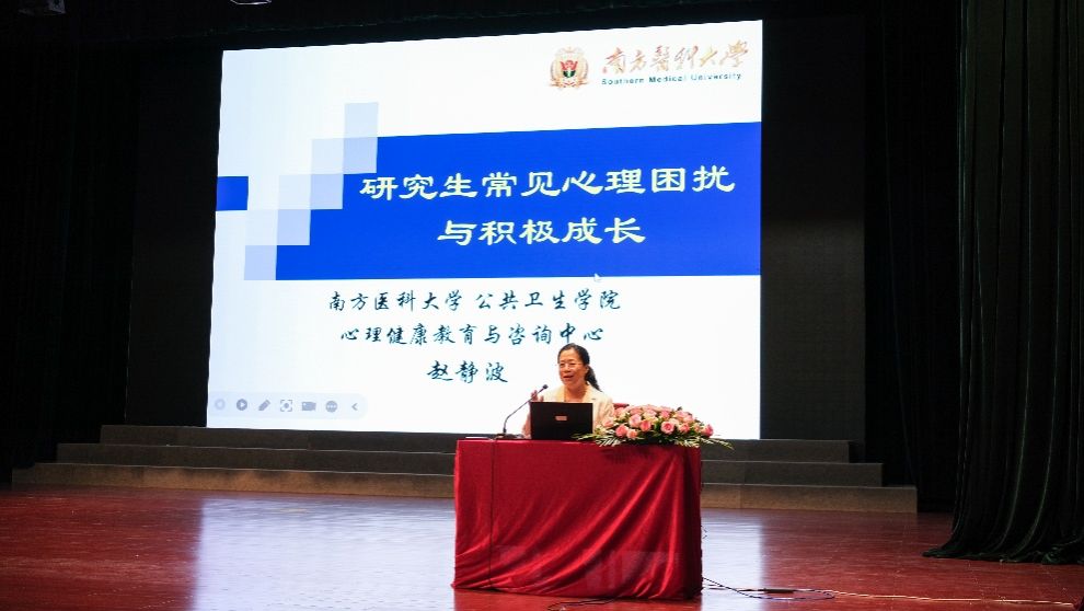 心理健康教育与咨询中心主任赵静波以“研究生心理特点与积极成长”为主题,介绍了研究生心理问题的四个主要类型,并提出八个积极成长途径,引导同学们学会调节自我情绪,以积极的心态面对每一天。
