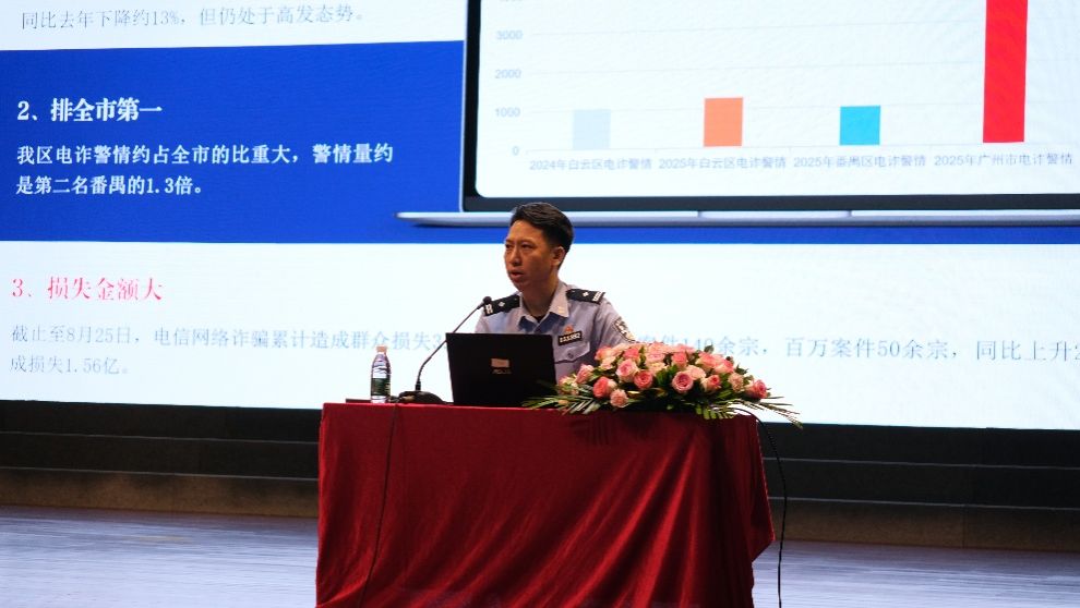 广州市白云区公安局常务民警薛源警官以“校园安全主题教育”为主题,介绍了电信诈骗的类型和主要诈骗手法,分析诈骗分子的话术和心理,警示同学们要学习法律知识,谨防被骗。