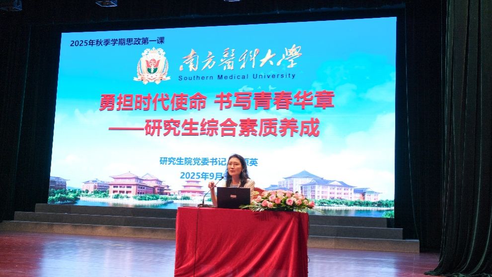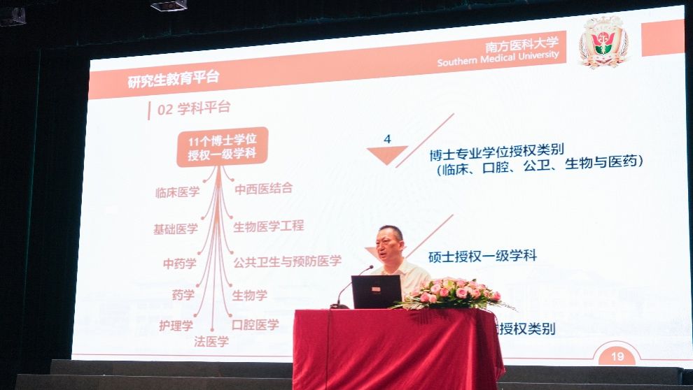 研究生院常务副院长黄文华以“南方医科大学学位与研究生教育概况”为主题,向同学们介绍了研究生教育的发展定位和我校研究生教育的基本情况,解读了相关制度和管理文件,勉励同学们在研究生阶段踔厉奋发,不断进取。