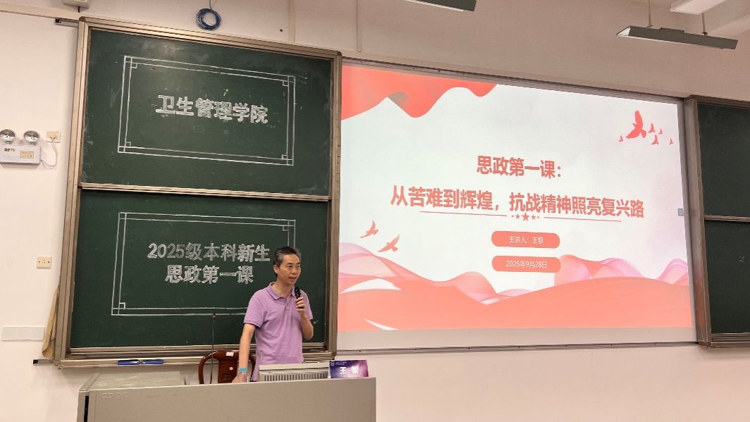 9月28日下午,卫生管理学院举办了以“从苦难到辉煌,抗战精神照亮复兴之路”为主题的新生思政第一课。学院党委书记王黎以史为鉴、以情动人,为2025级新生带来一堂兼具思想深度与教育温度的开学第一课。