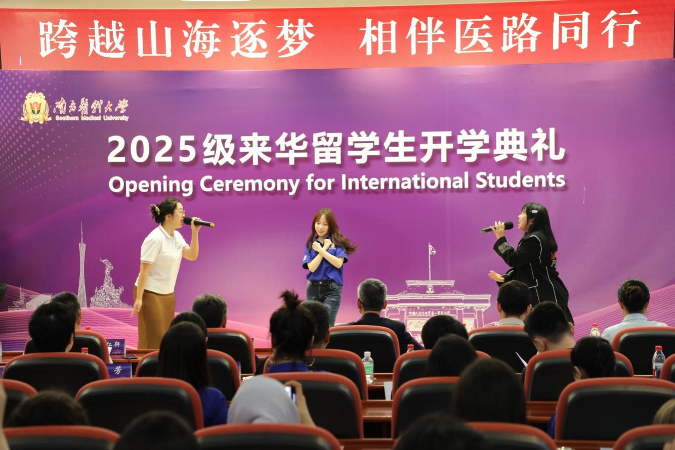 典礼最后,全体新生拳心相印,许下医者承诺。师生齐声合唱《爱在南方》,在激昂的校歌旋律中,300名来华留学生以“南医人”的姿态,赓续南医精神,誓言将致力捍卫人类健康,共同托起生命的希望。
