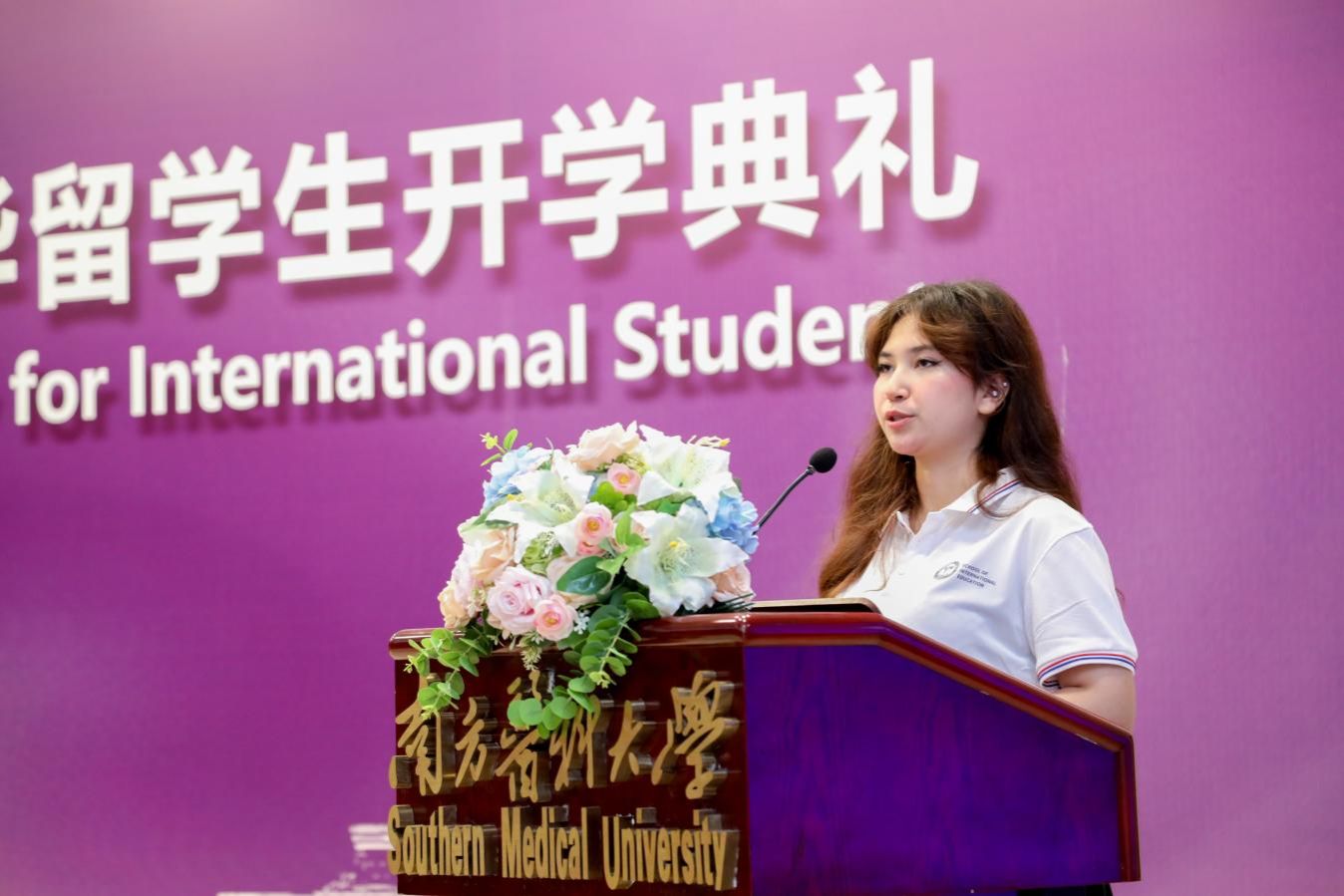 来自伊朗的2024级口腔医学专业(英语授课)本科生AMIRI AMIN ANAHITA(星星)作为在校生代表发言,分享其求学路上的成长体会。她鼓励新生把握在校每一刻,始终保持对医学的热爱与探索精神,拥抱文化多元,笃行医学梦想,为成长为兼具人文关怀与全球视野的卓越医学人才打下坚实基础。