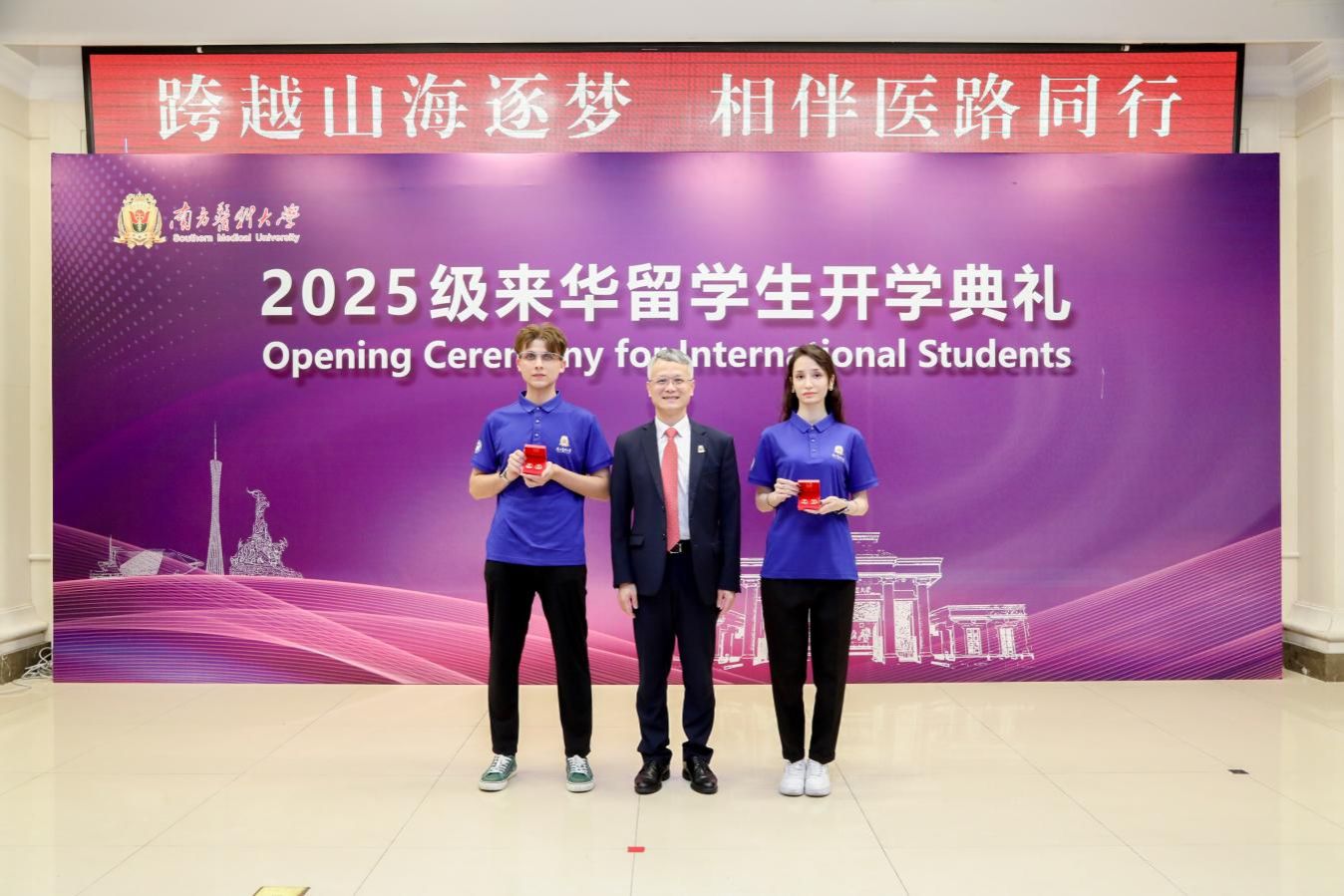 副校长许可慰为新生代表授校徽,标志着新生正式成为南医人。这枚校徽,托付的不仅是南医人的身份,更是“健康所系,性命相托”的医学使命与深切期许。