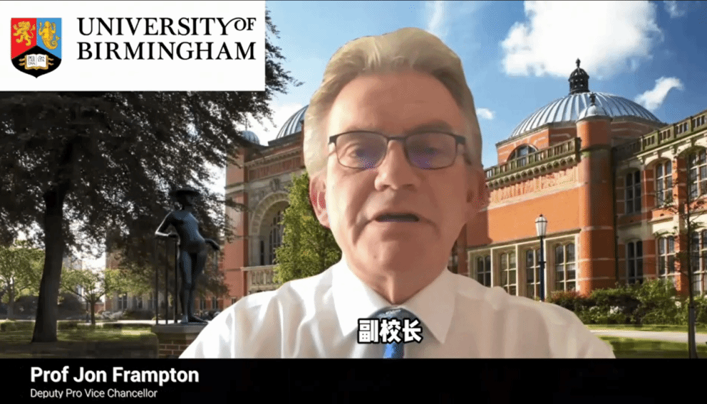 英国伯明翰大学副校长乔恩·弗兰普顿向同学们重点介绍了伯明翰大学深厚的学术底蕴与卓越实力,包括其正在庆祝建校125周年,以及医学院长达200年的悠久历史。