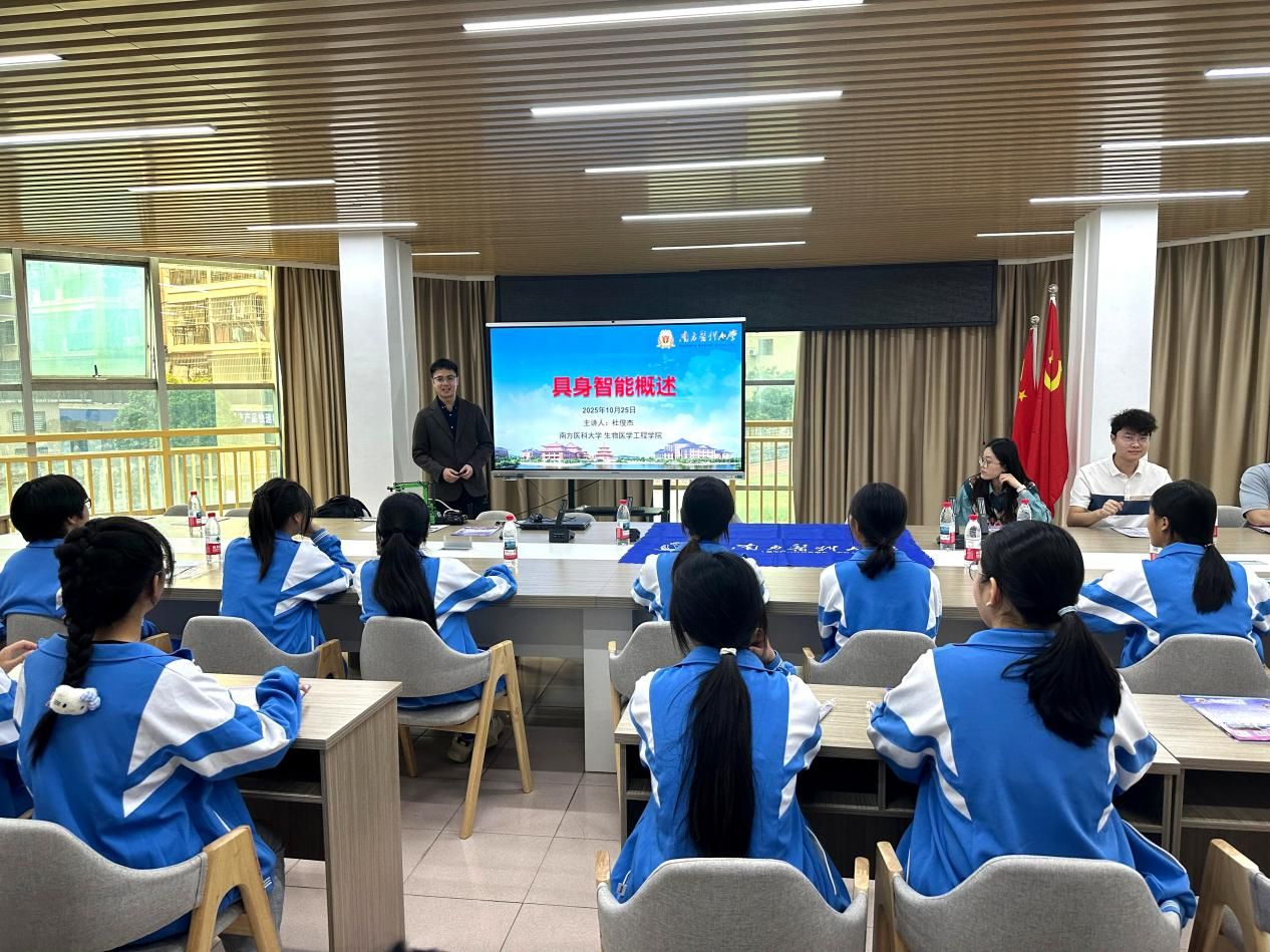 近日,韶关市曲江第一中学的校园里迎来了一场别开生面的科普盛宴。生物医学工程学院积极响应 “双百行动”号召,组织人工智能专业团队走进曲江一中,为这里的师生们带来了一堂聚焦机器人具身智能技术的前沿讲座。电子技术系教师杜俊杰博士携“Jetmax 三自由度机器人”,用生动的讲解与精彩的演示,在中学生心中播种下了探索科技奥秘的种子。