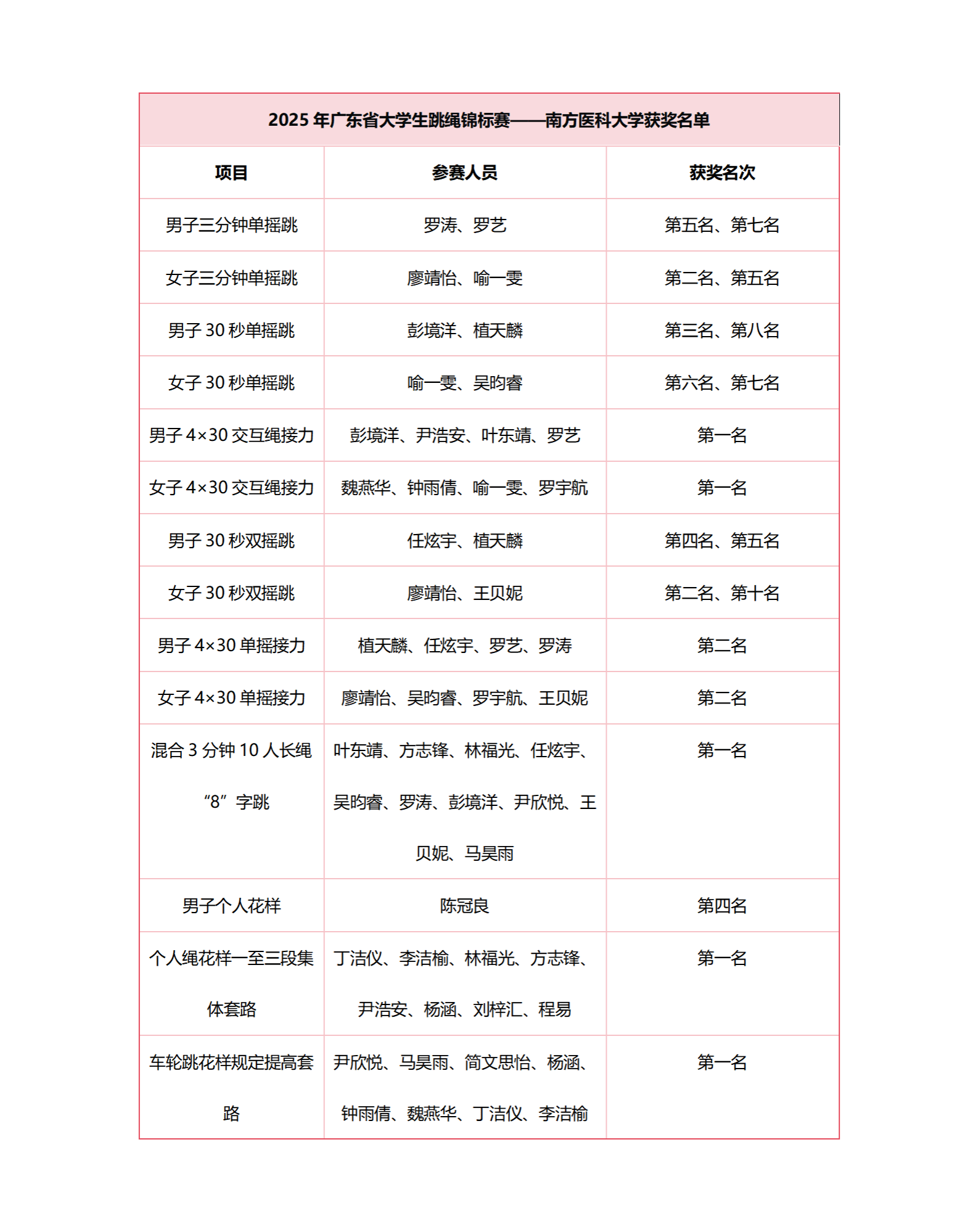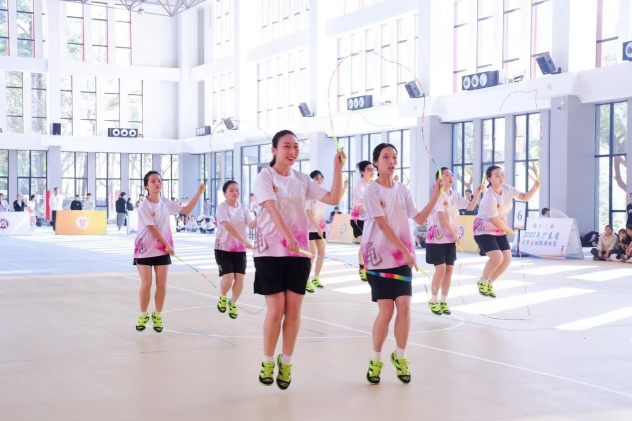 12月5日至7日,2025年广东省大学生跳绳锦标赛上,我校跳绳队队员与中山大学、深圳大学、华南师范大学和广州体育学院等高校的队伍同台竞技,凭借扎实的准备、出色的临场发挥与卓越的团队协作,在众多参赛队伍中脱颖而出,斩获包括男、女子4×30交互绳接力等5个项目的第一名、4个项目的第二名、1个项目的第三名以及若干奖项,同时荣获团体甲组总分第一名的佳绩。比赛由广东省学生体育艺术联合会主办,共有速度、接力、花样等11个项目。