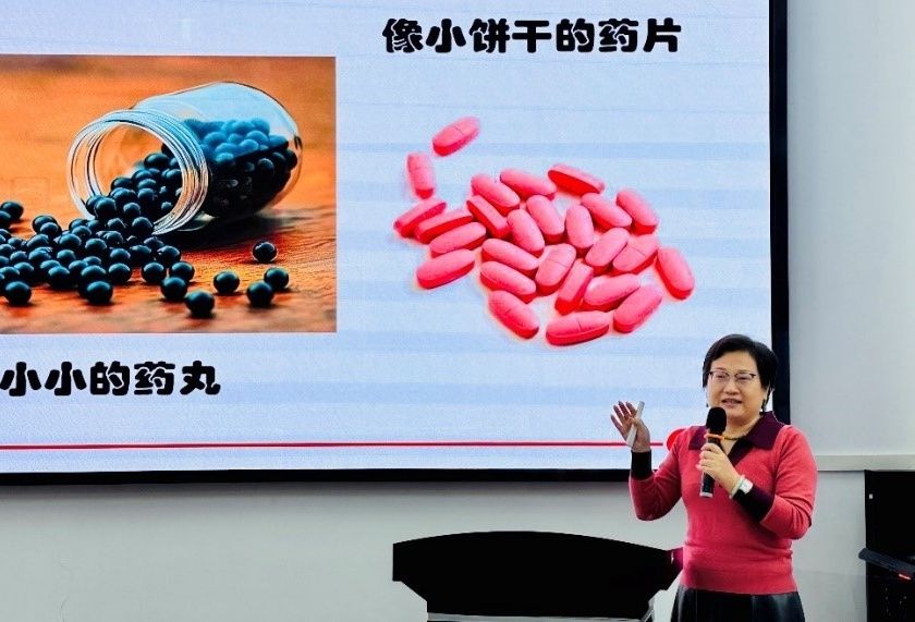 捐赠仪式后,“用药安全,健康科普”专题讲座随即展开。药学院临床药学系主任、第二党支部书记王文雅以《小学生用药常识大揭秘》为题,用通俗易懂的语言和生动有趣的案例,为四至六年级约80名学生系统讲解了药品基本分类、药物服用方法及滥用药物的危害等用药常识,旨在引导大家树立安全用药、科学用药的理念,现场互动踊跃,气氛热烈。