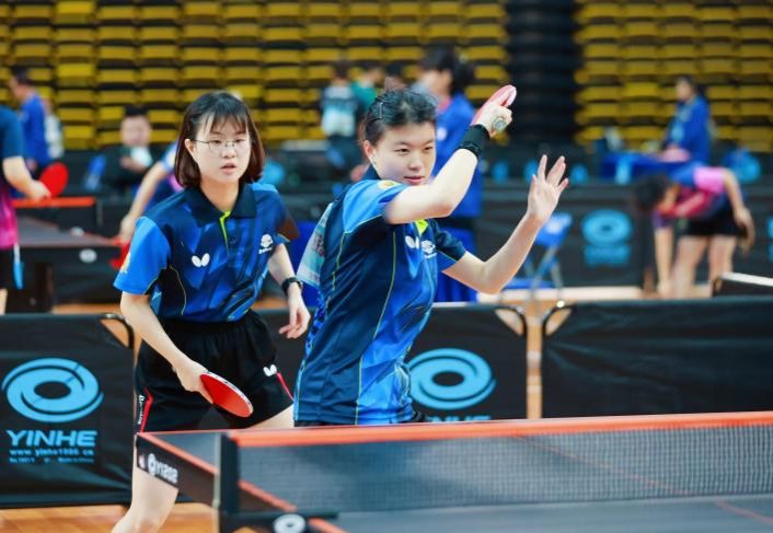 杨懿钰与程佳怡在比赛中南方医科大学乒乓球队获甲组一等奖