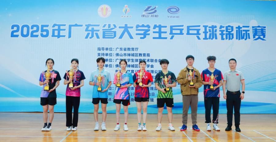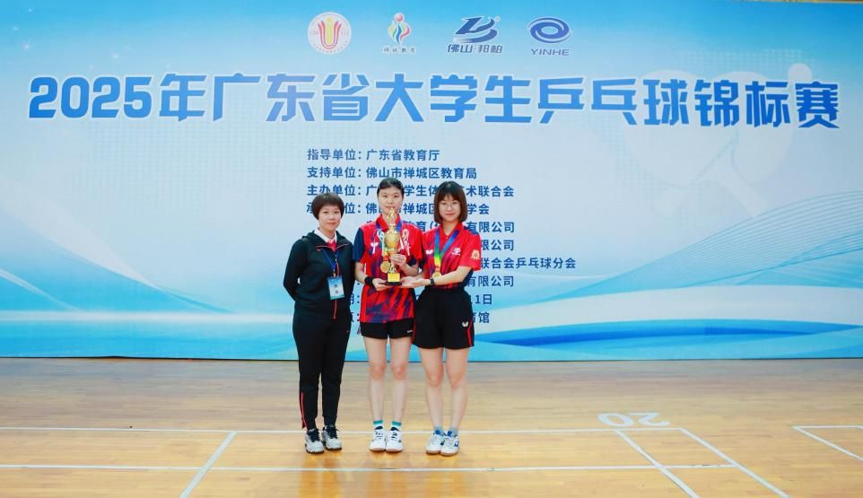 12月8-11日广东省大学生乒乓球锦标赛中,我校乒乓球队女子双打杨懿钰与程佳怡拿下省冠军,突破历史创最佳成绩,同时我校乒乓球队获甲组一等奖,曹静茹获优秀教练员称号。这场由广东省教育厅主办、广东省学生体育联合会承办的省内高校乒乓球年度顶级赛事,吸引了102所学校,999名乒乓健儿同台竞技。