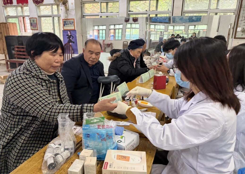 针对乡村“看病远、咨询难”的痛点,团队将“移动健康检测站”直接设在维新村委、齐乐村委等点位,借助村干部广播通知、微信群召集,让行动不便的老人、慢性病患者足不出村就能享受诊疗服务。清晨八点,由三张桌子拼起的简易检测台便热闹起来,血压计、血糖仪、听诊器整齐排列,团队成员分工明确,测指标、记数据、答疑问,忙而不乱。