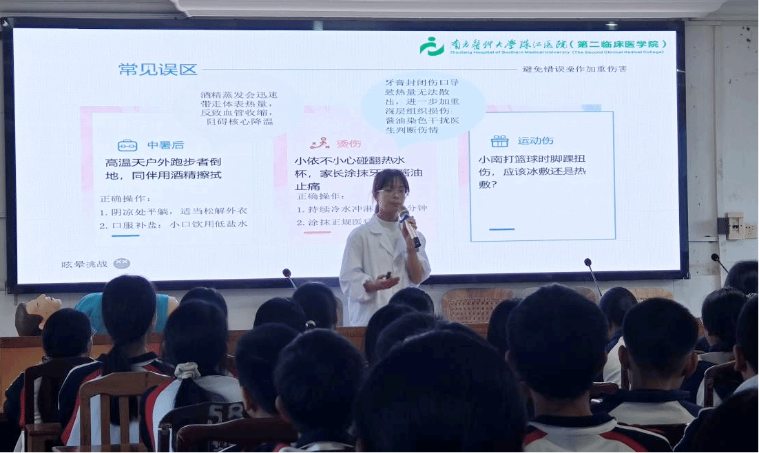 面向1-6年级学生,通过卡通教具、药品分类游戏、非遗醒狮运动实践等趣味形式,开展传染病预防、安全用药等课程,将抽象知识具象化;针对7-9年级学生,聚焦伤口处理、骨折固定等应急技能实训,搭配模拟教具分组实操,提升自我保护能力;为高中生设计的情绪管理、学业规划、高效学习方法等课程,结合高考备考特点提供针对性指导,助力学生明确成长方向。