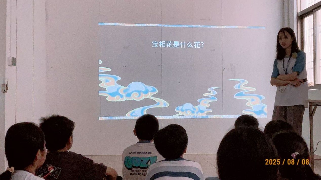 课堂上,孩子们起初因纹样复杂而面露难色:“姐姐,这太难了,我做不了。”但江楚盈与助教团队始终耐心鼓励,通过“看,这样弯曲,再轻轻一绕,就形成花瓣了”的示范,引导孩子们逐步完成作品。当一名孩子最终举起自己制作的宝相花兴奋呼喊:“蛙蛙(江楚盈义教期间的昵称)姐姐,我做到了!”那一刻,传统美学在乡村课堂绽放出新的生命力。