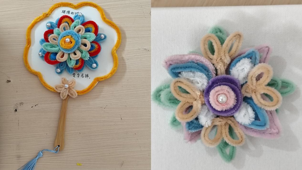 面对网络教学资源匮乏的挑战,江楚盈主动创新教学设计,以“宝相花”这一传统吉祥纹样为主题,设计了一节扭扭棒手工课。她先亲手制作样品,再拆解步骤、简化流程,最终录制专属教程,将复杂的纹样转化为孩子们可操作的趣味活动。