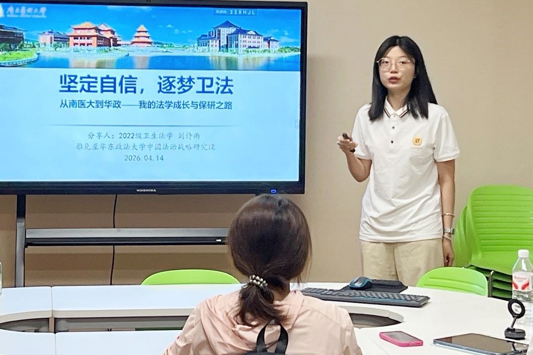 2022级卫生法学专业学生刘诗雨以“坚定自信,逐梦卫法”为主题,分享了从南医大到华东政法大学的保研成长之路。她从定位抉择、时间规划、申请策略、复试准备、心态调整五个方面,详细讲解保研全流程,建议低年级学子先夯实学业基础、主动参与科研,高年级学子做好院校梯度规划,采用“三天冲刺法”高效备战复试,以从容心态应对保研路上的不确定性。