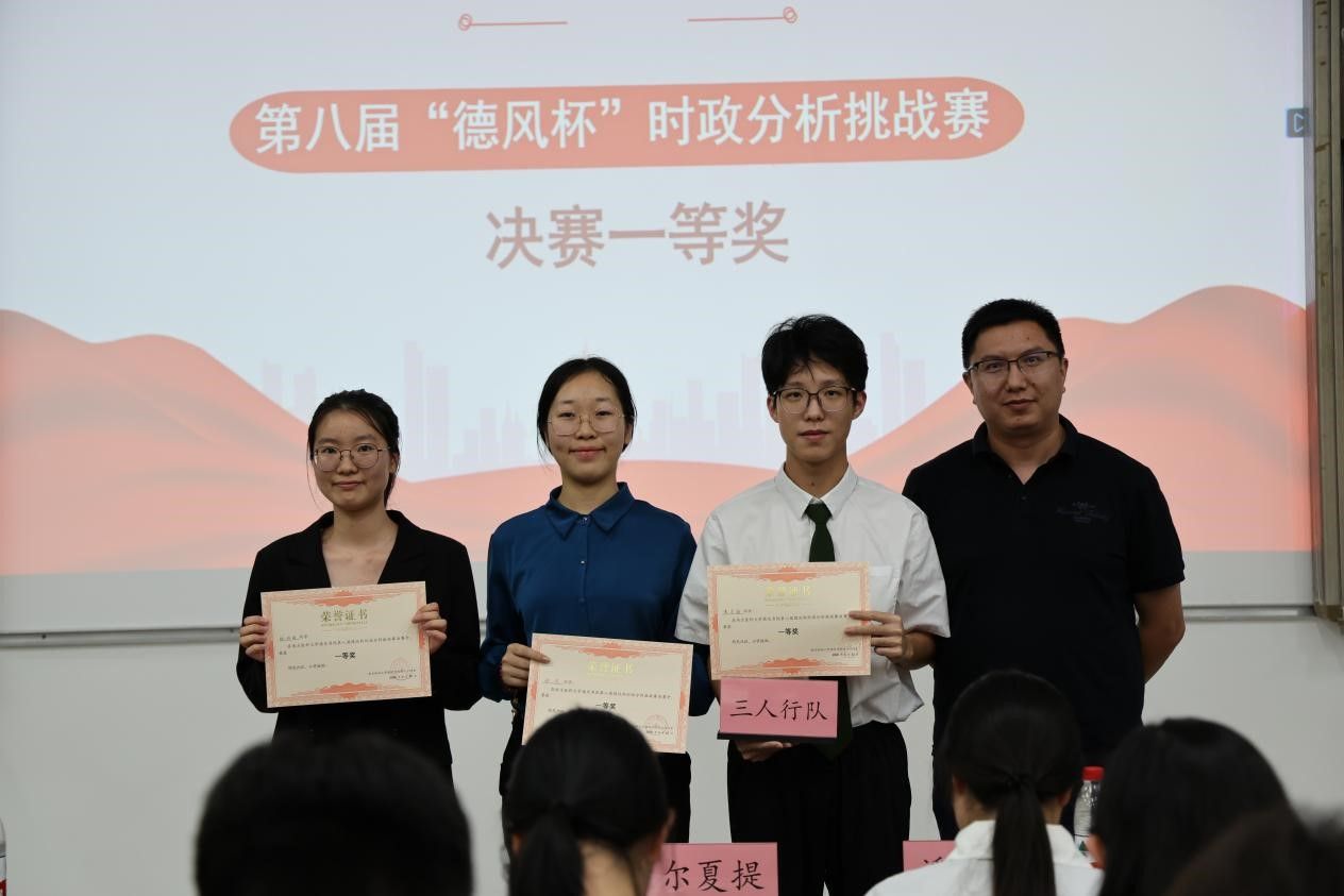 经过评委老师们的综合评定,最终“三人行队”脱颖而出,荣获决赛一等奖;“啊对对队”“人民当家做组”获得二等奖;“政知灼见”“赤心逐光队”“何时雨队”获得三等奖。作为德风书院的特色品牌活动,“德风杯”时政分析挑战赛已成功举办八届,在这里,青年学子们以笔为剑、以思为锋,在时政分析中读懂中国,在观点碰撞中坚定初心。