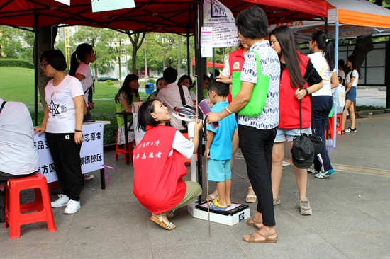 体检摊位中,志愿者们耐心地为市民测量血压、身高及体重,并计算BMI指数,给市民提出健康生活的合理建议。游戏摊位吸引了很多小朋友,他们通过药品拼图和绕口令等小游戏,学到了不少药品知识。咨询摊位同样吸引了不少市民,向义诊的医生提出了很多困扰着他们的问题,如脸上的痣要不要切除、化妆品过敏怎么办、荨麻疹如何治疗、抗生素如何选择等,几位药师和皮肤科医生都耐心解答,给出了中肯的指导。
