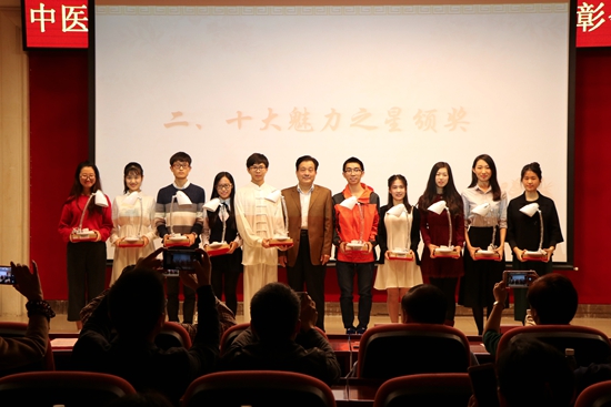 中医药学院响应“筑梦引航”工程“榜样导航”的号召,启动中医药学院精英引领计划之“十大魅力之星”评选活动。今年是中医药学院“十大魅力之星”评选活动的第二届,2014级中药学专业刘祎同学荣获“领袖之星”、2013级中医学专业王婉先同学荣获“学习之星”、2012级中西医临床医学专业赵迪同学荣获“科研之星”、2013级中医学专业冯丽萍同学荣获“服务之星”、2014级中西医临床医学学专业叶景焕同学荣获“自强之星”、2013级中医学(针灸推拿)专业郑景全同学荣获“体育之星”、2015级中医学专业董晓飞同学荣获“才艺之星”、2013级中药学专业乔泽平同学荣获“创业之星”、2014级中药学专业张秋楠同学荣获“公益之星”、2015级赵婷玉同学荣获“社团之星”。