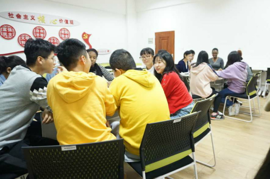 活动前,工作人员将学生们分成两组,并安排同组学生就坐。活动以“自由讨论”的形式开始。讨论中,中国学生与留学生相互交流,相互认识。留学生分享了他们在中国的生活习惯、最喜欢吃的中国菜以及曾经游玩过的旅游景点。中国学生也从交流当中见识到了中外文化的差异,体会到了留学生眼里的中国情怀。