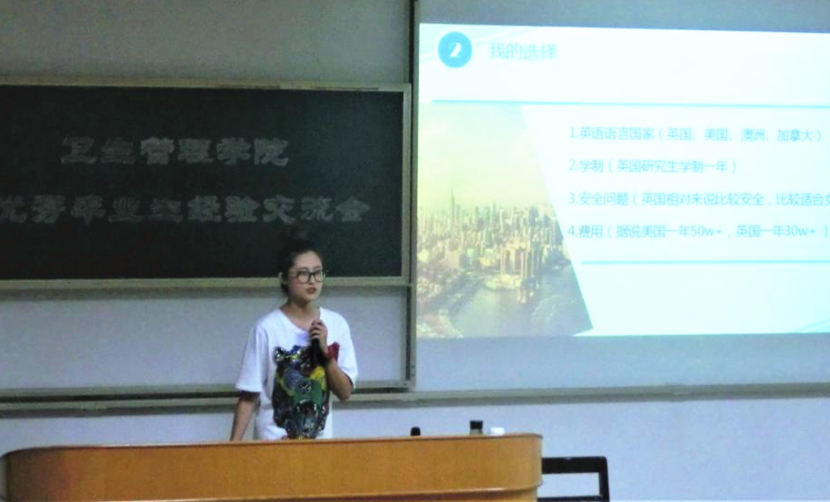 张钟元已成功拿到了四个国外学校的“入场券”,并最终选择了曼彻斯特大学。她叮嘱学弟学妹们要“运筹帷幄之中,决胜千里之外”。分别从选择国家、选择学校、申请准备三个方面进行了详细的介绍。张钟元提到出国留学要考虑多方面因素,比如英语语言国家,学制,安全问题以及费用等。