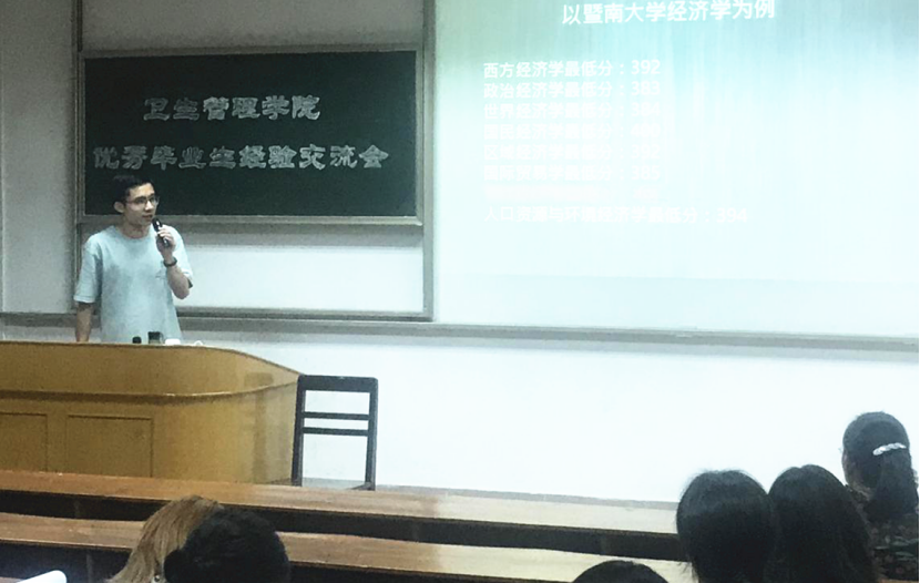2015级经济专业的徐朝澎调剂至广东财经大学。他着重了分析了近两年目标学校的报考及录取情况,让大家更为直观地了解到考研的优势、劣势、机会以及要面临的问题。从院校选择、复习安排以及面试准备等方面介绍了自己的考研经验,鼓励大家怀揣梦想,勇于尝试。随后,他给在场的同学们分享了几个获取考研信息的渠道(研友、师兄师姐、网络、研招办),提醒大家要做好几个选择(时间、学校、专业、资料、考研伙伴),制定合理的作息计划和复习计划。
