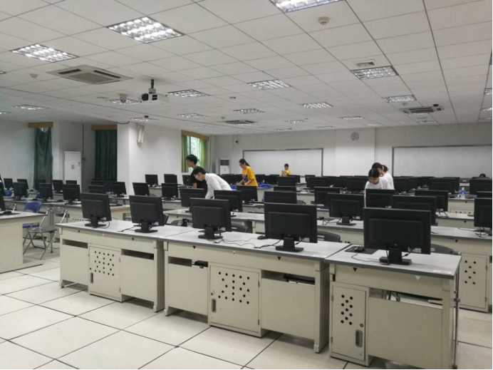 本科生第二党支部全体成员来到教学馆三楼机房打扫卫生,经过同学们一个多小时的辛勤劳动,三间机房教室除旧貌,换新衣:黑板光洁如新,电脑、键盘和椅子排列整齐一致,地板干净,让人赏心悦目。
